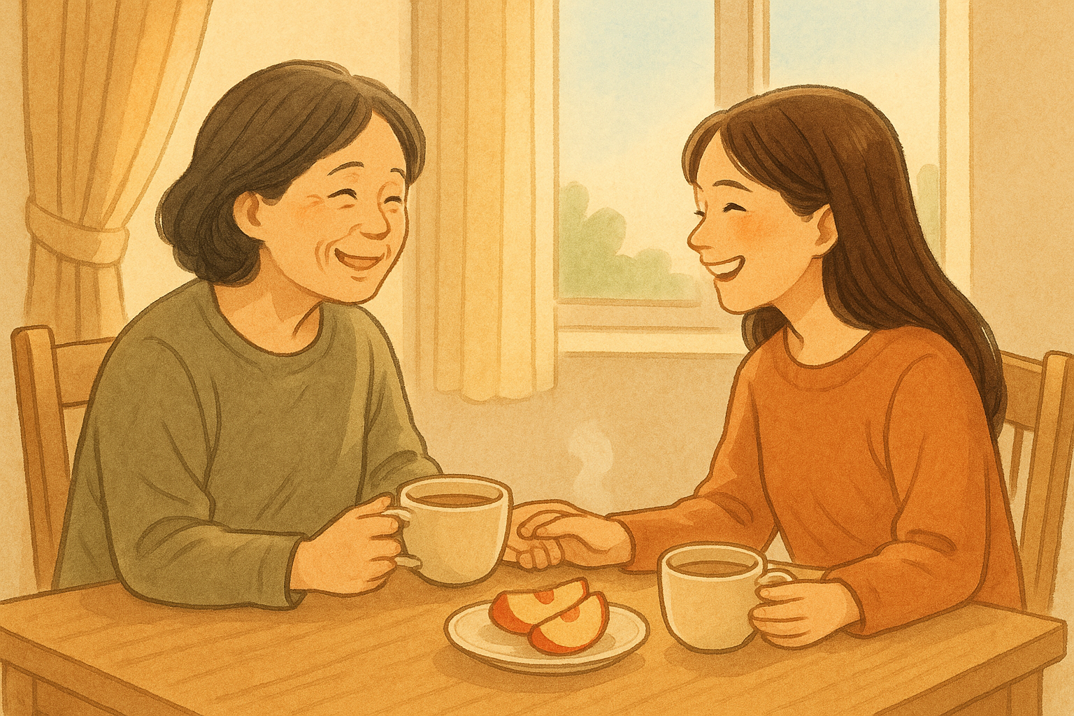따뜻한 차 한 잔과 잘 깎은 사과 한 조각을 대접해요.